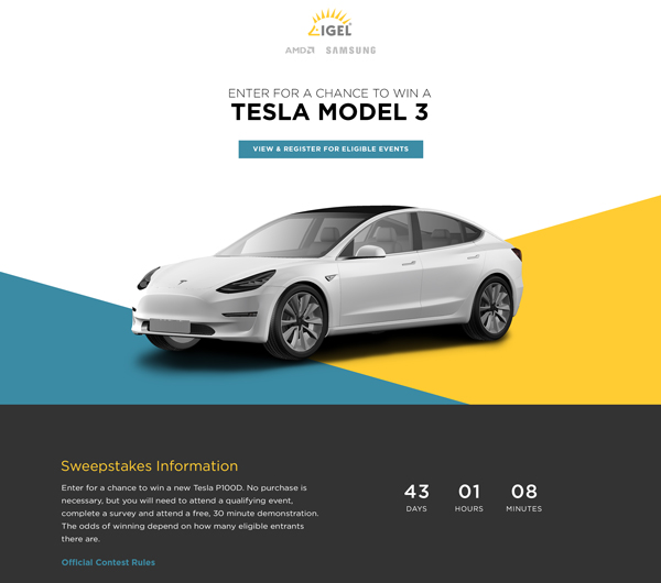 For example, here was IGEL’s new Grand Prize: a new Tesla P100D. This is the IGEL version of cars — highly innovative, software-defined, capable of self-driving and goes from 0 to 60 in 2.2 seconds. Signing up for a demo would automatically enroll you into the grand sweepstakes, to be announced at VMworld 2017 — no purchase necessary.